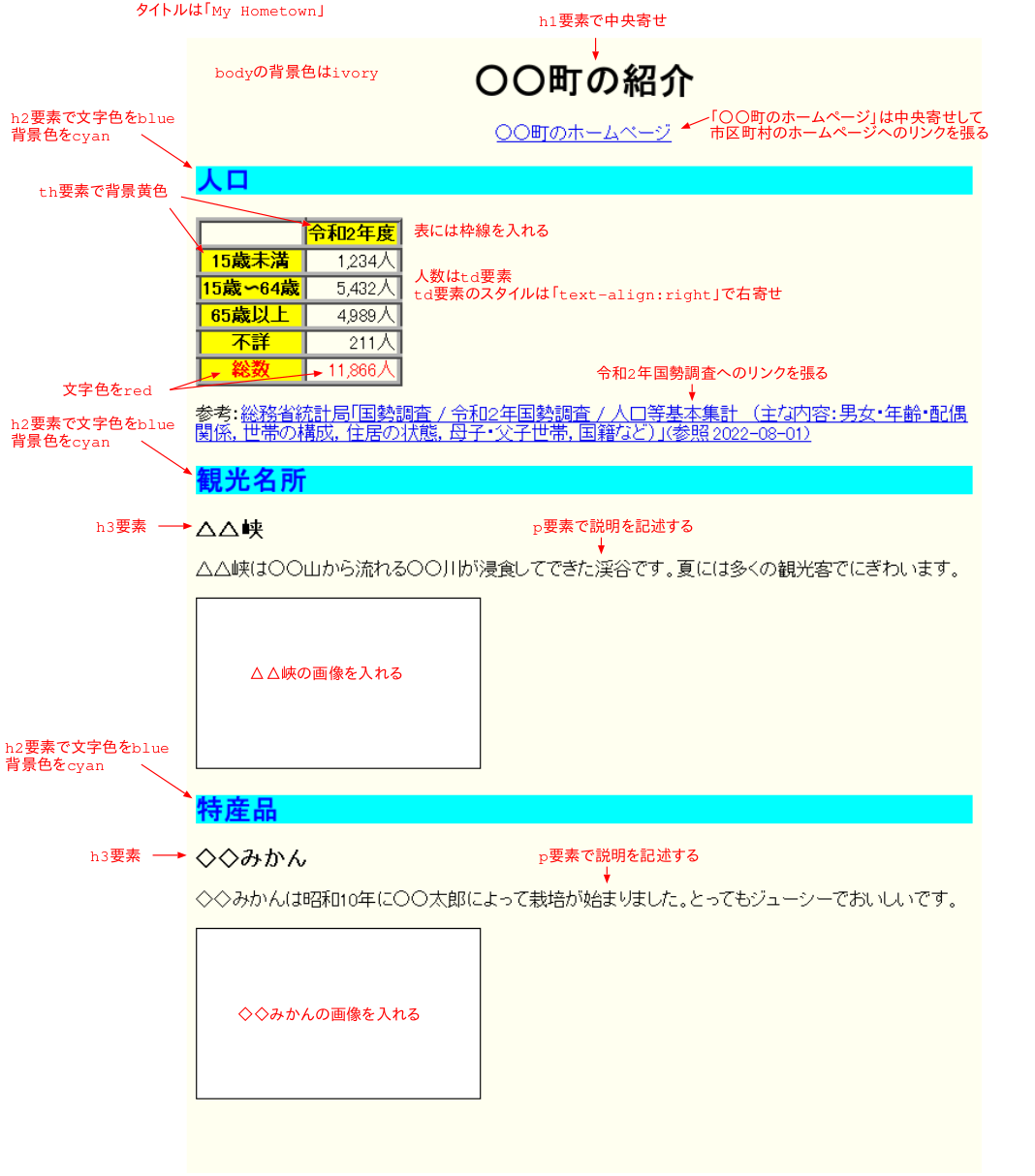 - 市区町村の観光名所を一つ、特産品を一つ入れて解説する(例では「△△峽」「◇◇みかん」になっている)。画像は市区町村か観光協会のホームページから選び、その画像への URL を使って入れる。
