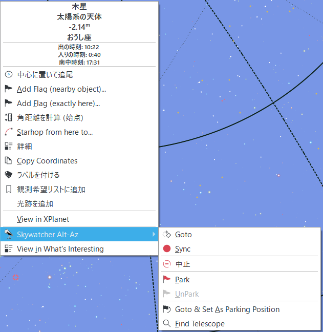 - KStars で、その目標の天体の上で右クリックして [Mount名]→[Sync]をクリックすると sync point が作られて望遠鏡架台と INDIサーバーのマウントドライバの座標の同期が行われる(one star alignment)。
