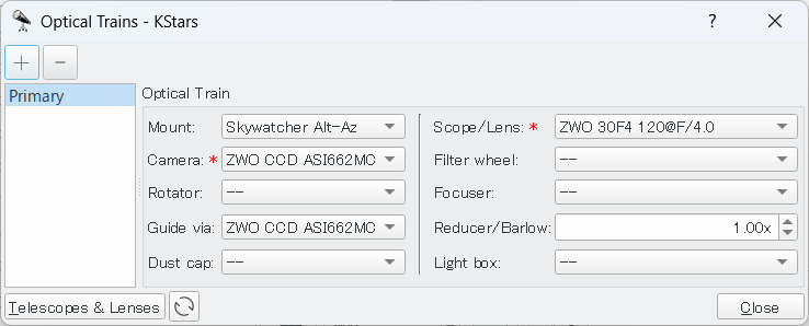 Scope/Lens については以下の手順で使用する鏡筒などの情報をリストに追加しておく必要がある。 これがないと Plate Solving による自動アラインメントができない。
