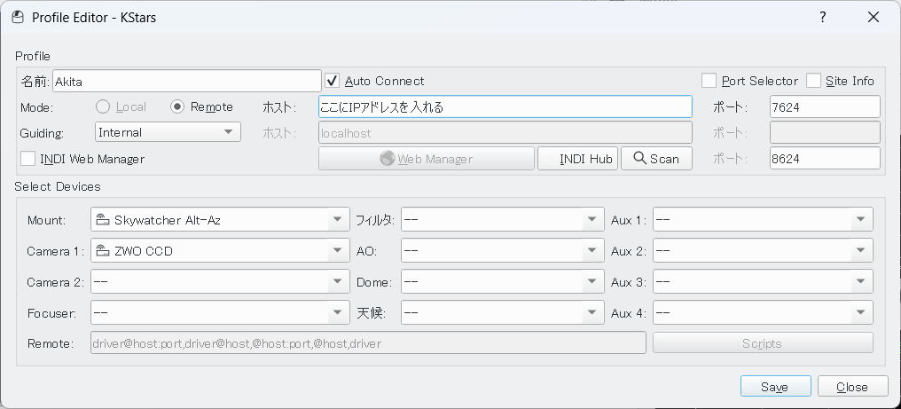 - Mode は [Remote] を選択してホストには INDIサーバーの IP Address を入力する。